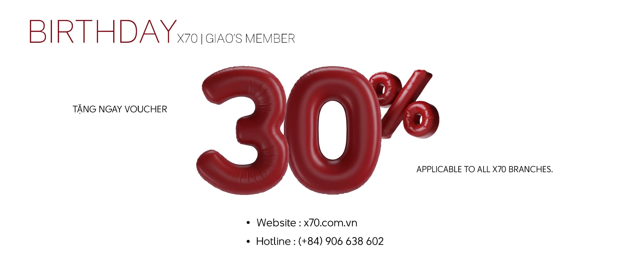 Nhân dịp sinh nhật, X70 gửi tặng voucher ưu đãi 30% như một lời chúc mừng, mong mang đến thêm niềm vui trong tháng đặc biệt này.